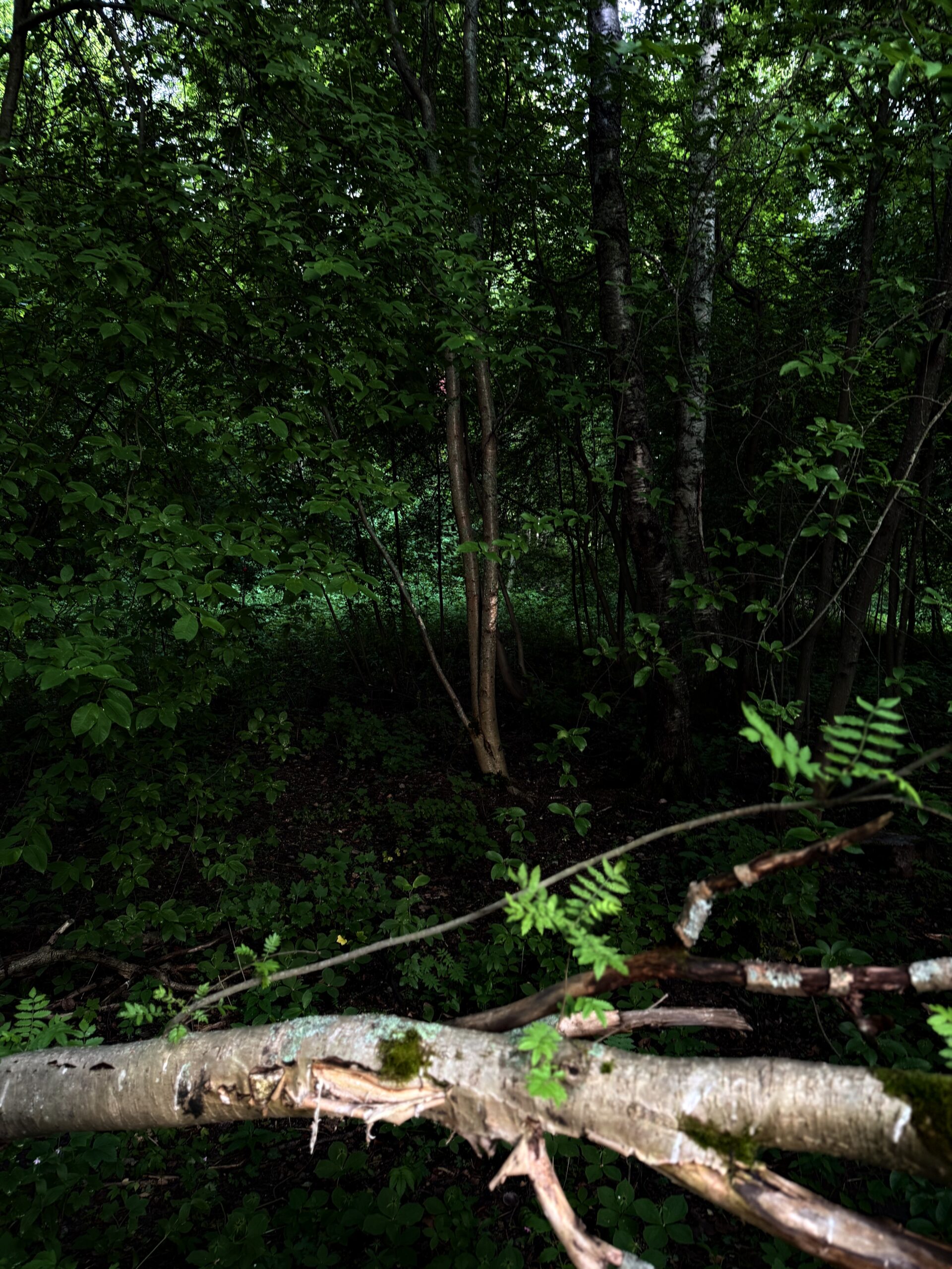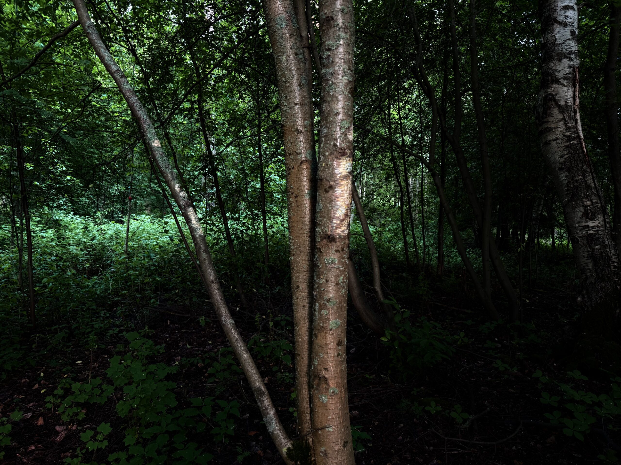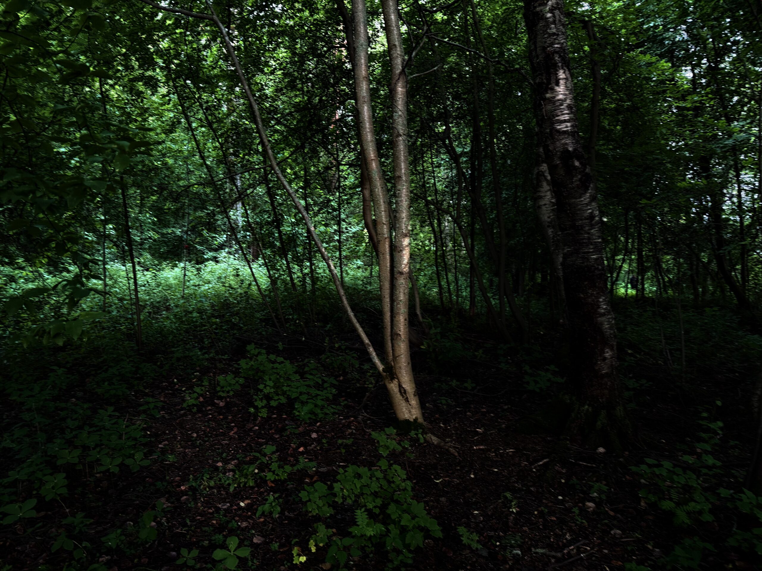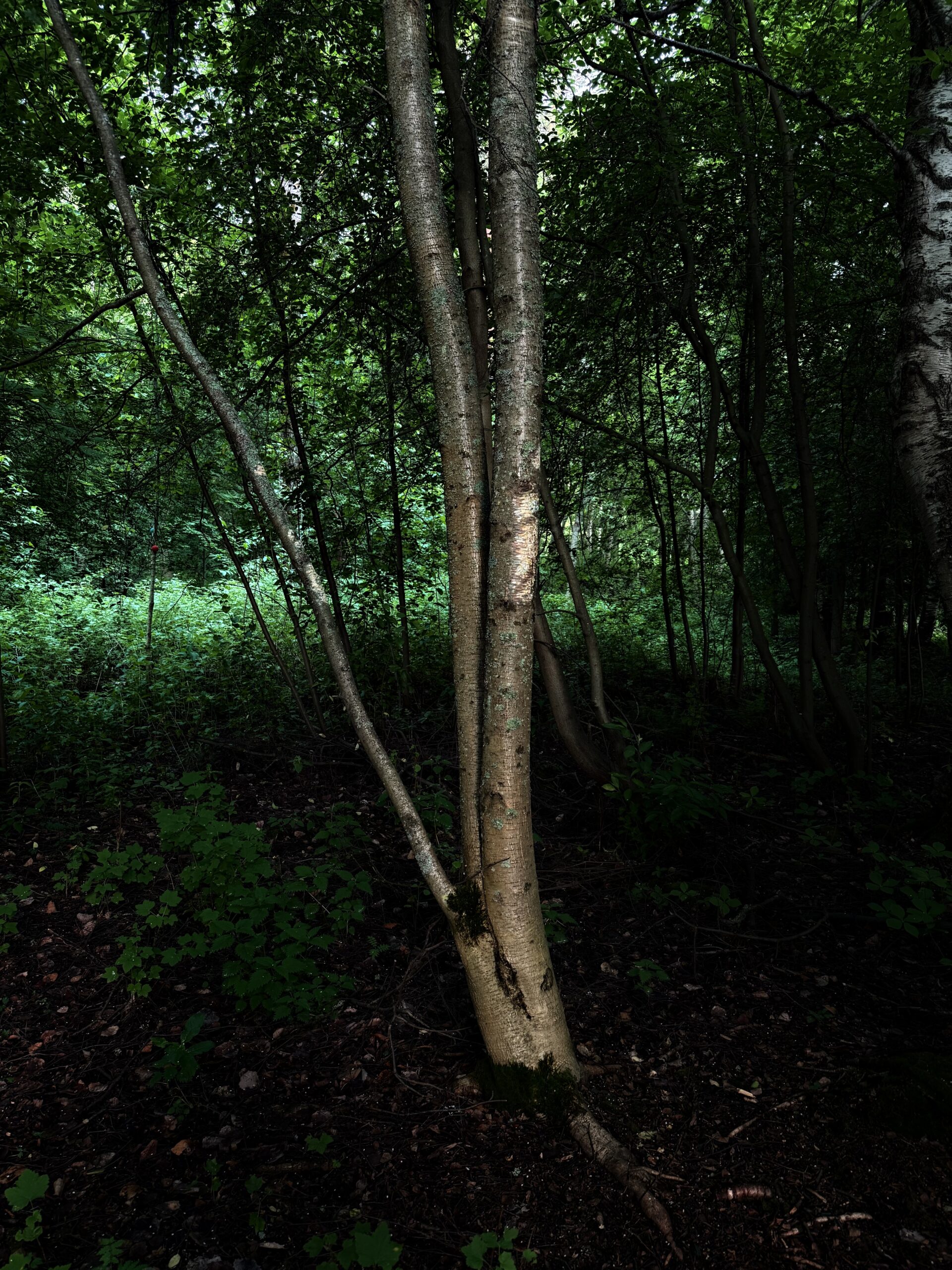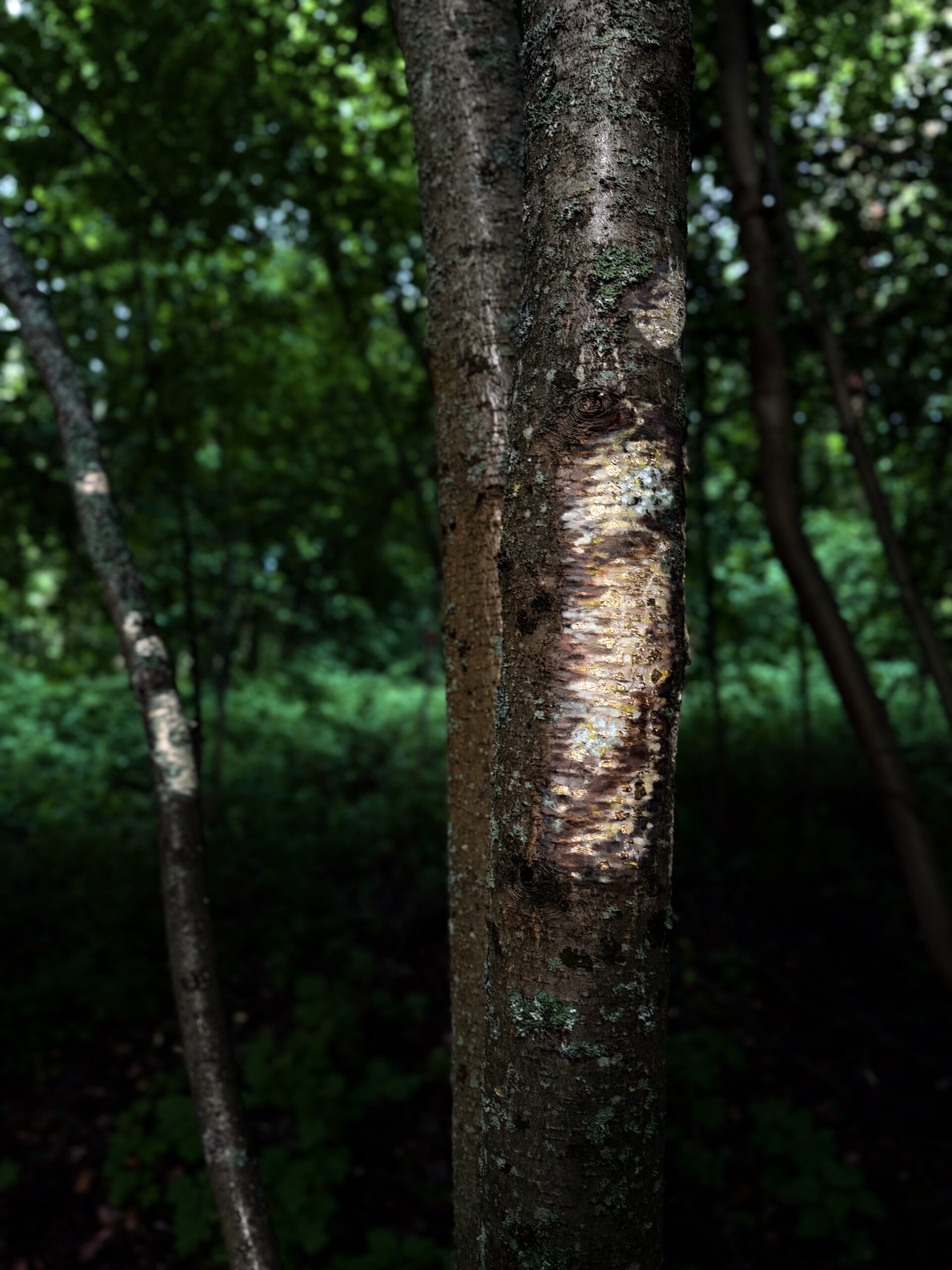 The artwork stems from a love for the dappled sunlight found in forests, and it aims to draw the viewer’s attention to these fleeting patches of light. The exhibition sign is placed at the edge of the woods, and when looking into the forest, one might notice a more static light spot on a single rowan tree—visible even on grey days. This light patch is painted to mimic real sunspots, applied onto the tree’s surface using paper and wheat flour glue. The painting is done in traditional oil paints, with a final touch of gold leaf that reflects light. The piece is subtle, and not every visitor may notice the painted spot—but likely they will find themselves observing light and sun patches in the forest, hopefully even after leaving the site. Or perhaps the viewer has imagined what an eternal spot of sunlight could mean.