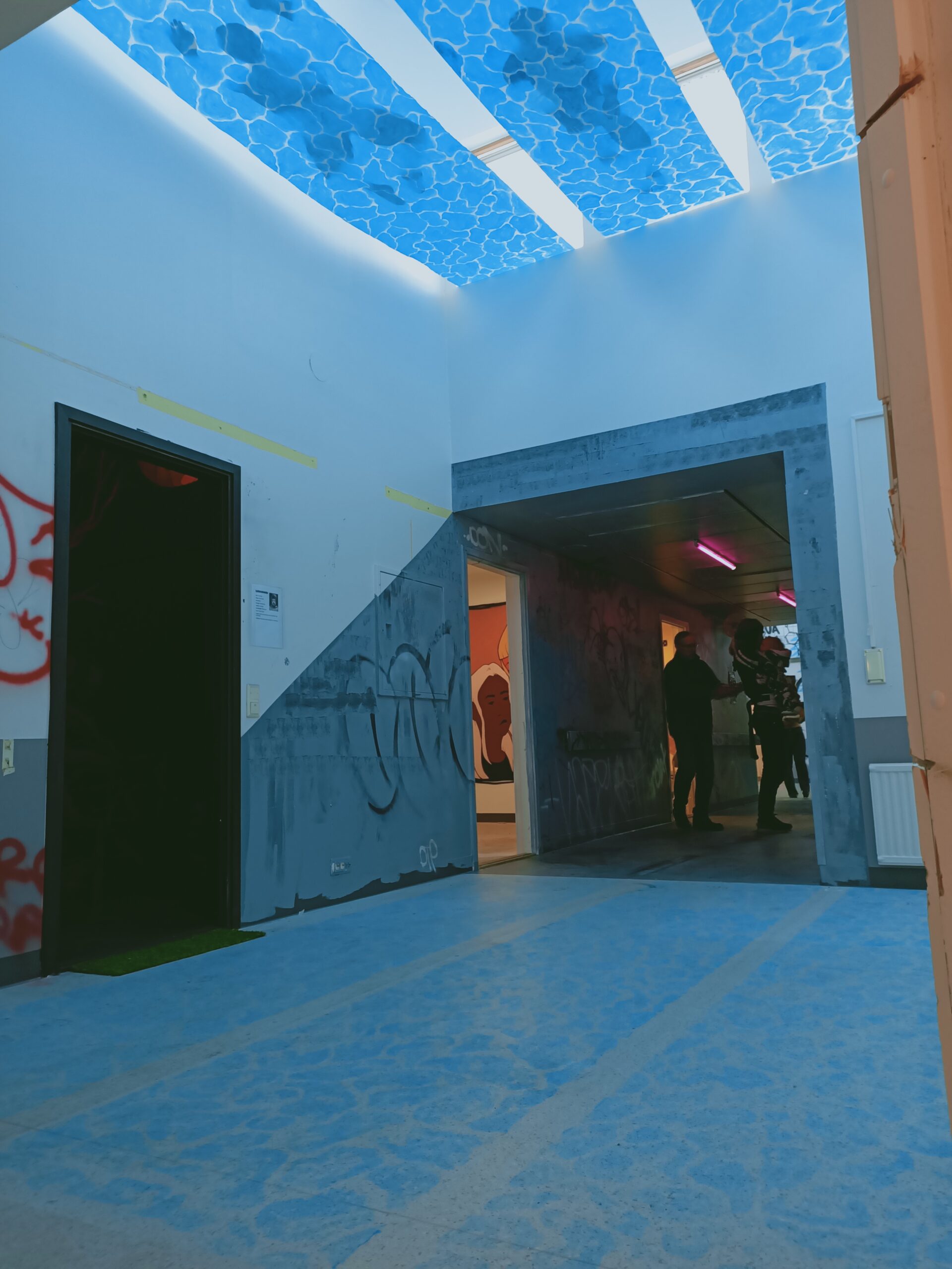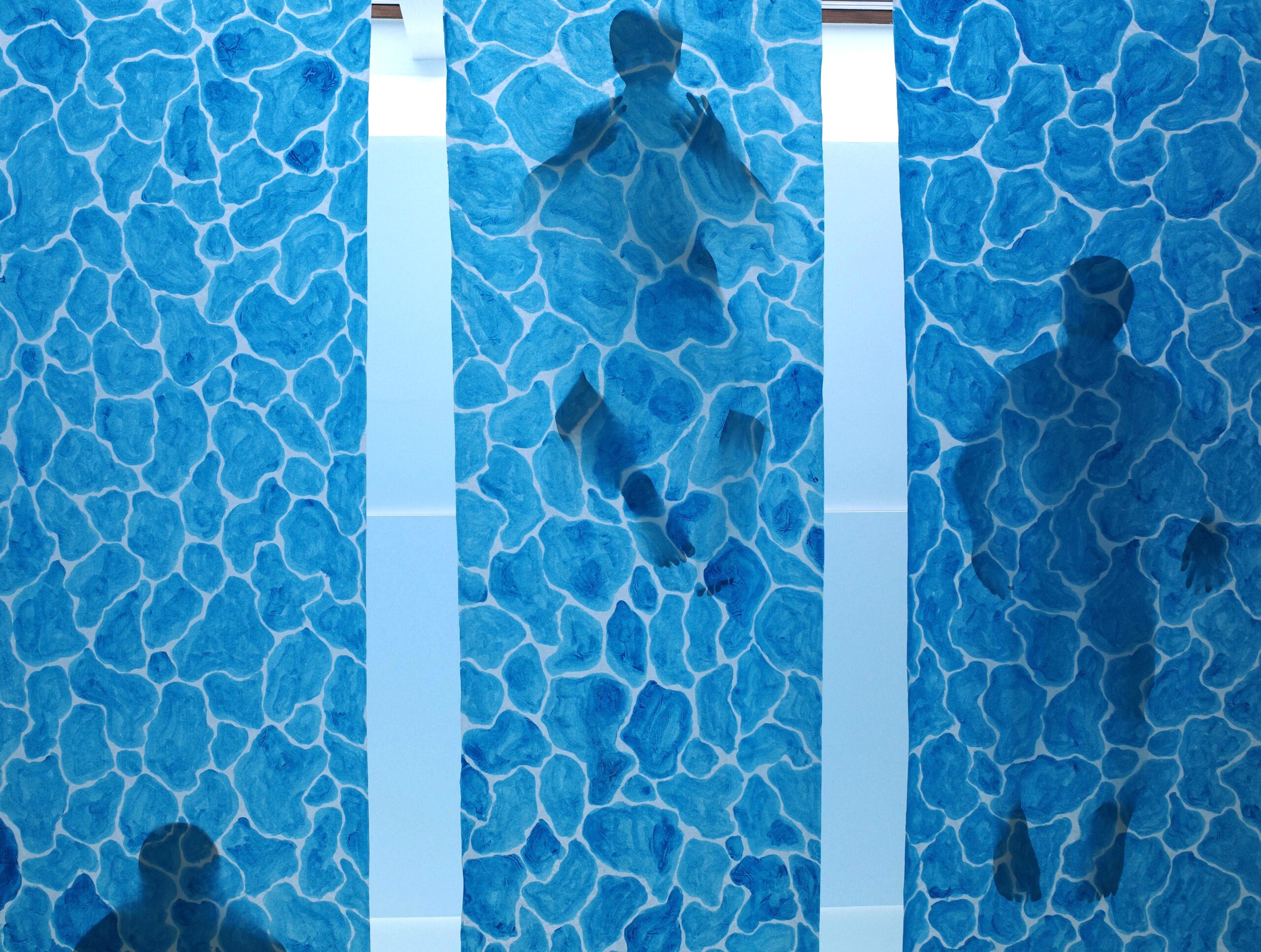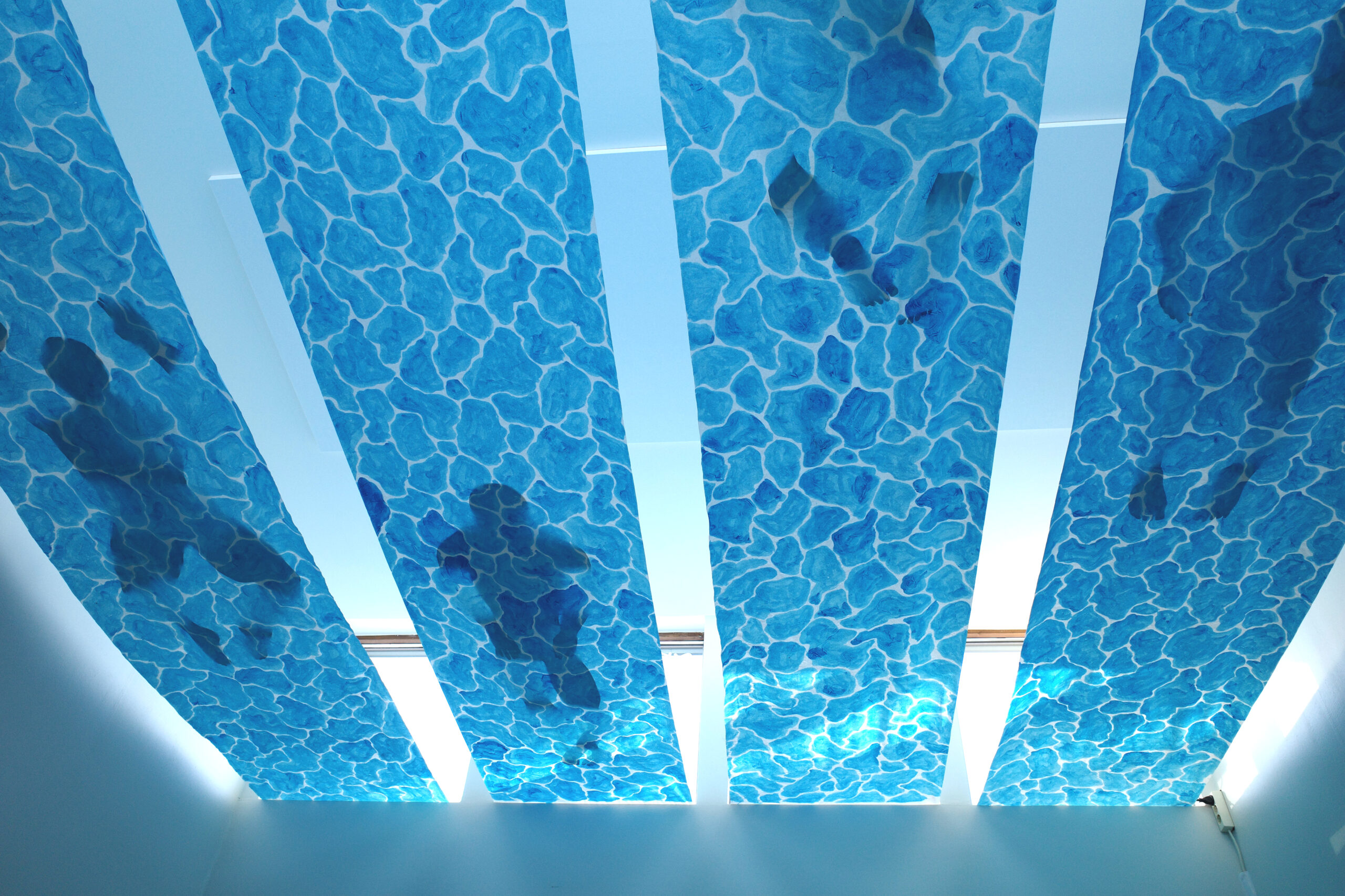 The artwork was created for an art exhibition held in a building scheduled for demolition (Mediart by Re:Formi), with the theme of health, inspired by the building’s history as a health center. I was given a small lobby space with four opposing windows, which led my thoughts to swimming lanes. I wanted to take advantage of the upper windows in the lobby to backlight paper. My goal was to explore the three-dimensional shadow qualities of paper—how a cut-out human figure would only partially appear through a painted paper swimming pool. I had long wanted to experiment with paper on a large scale, hoping to demonstrate its potential as a material for public art. In paper-based works, placing the piece out of reach is essential, which led me to install the artwork on the ceiling—or rather, just below it—high enough to prevent physical contact. This also gave the swimmers and swimming lanes an ethereal nuance. I was reminded of the old Roman saying: “Mens sana in corpore sano”.