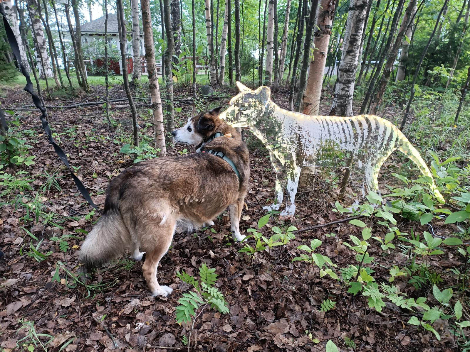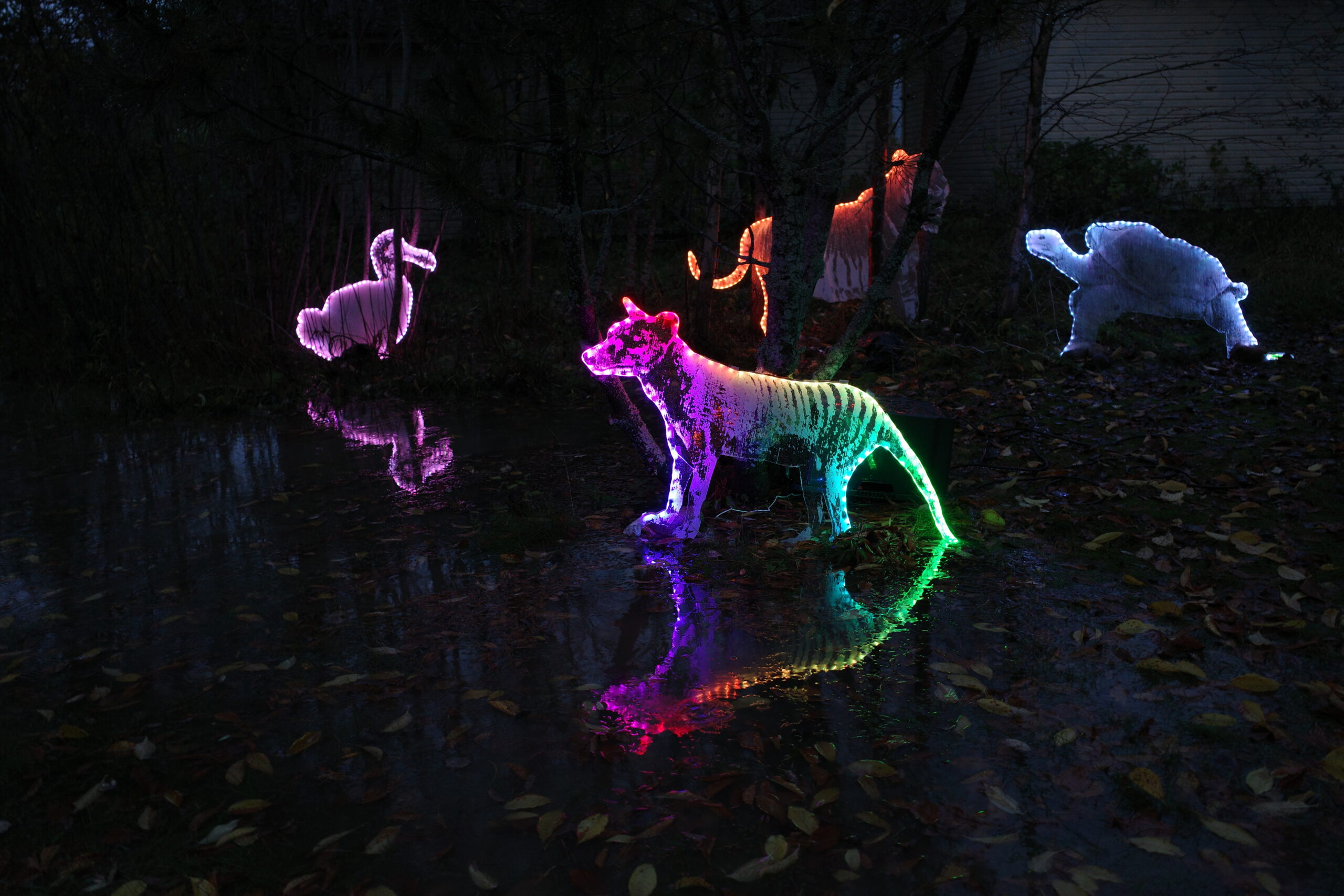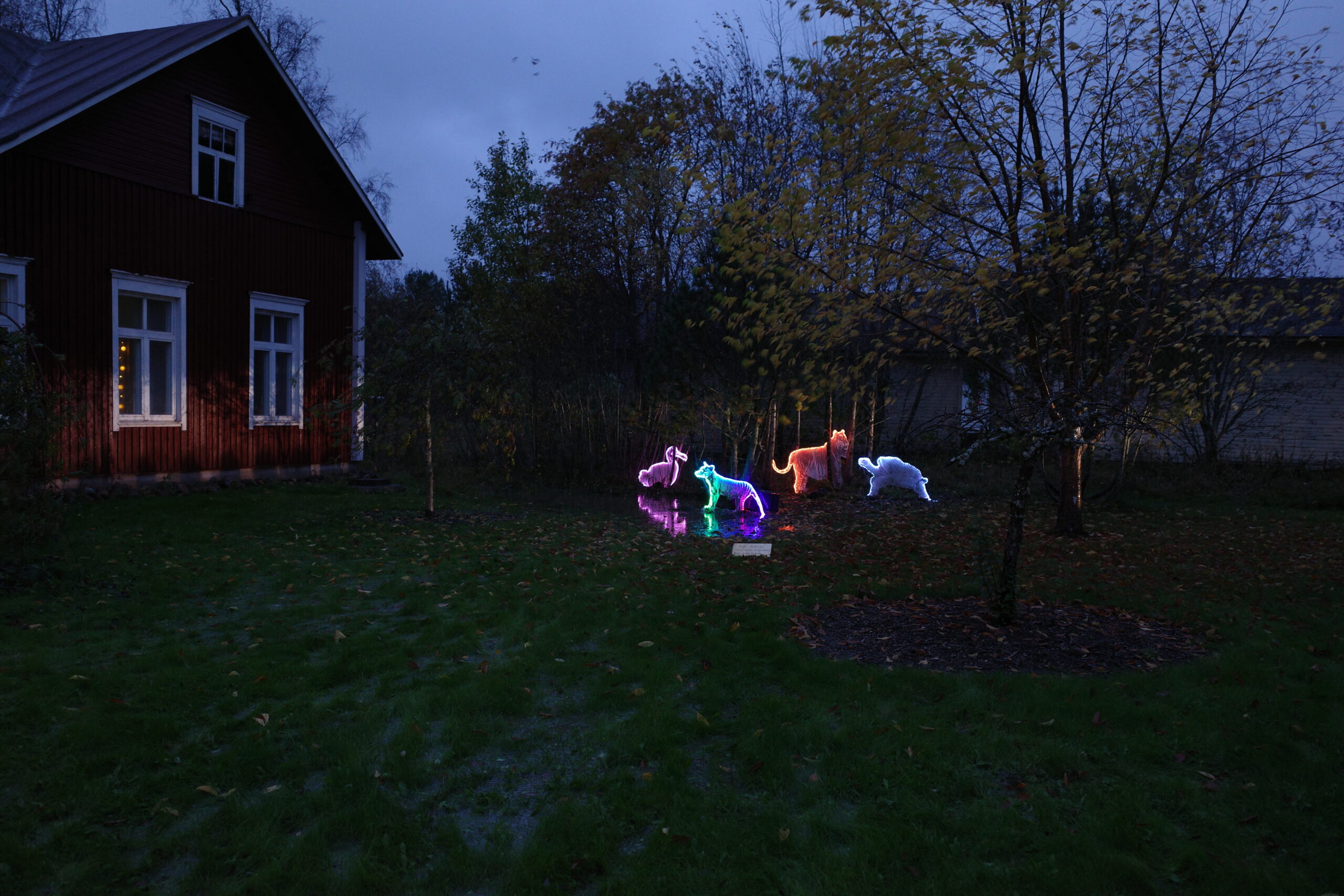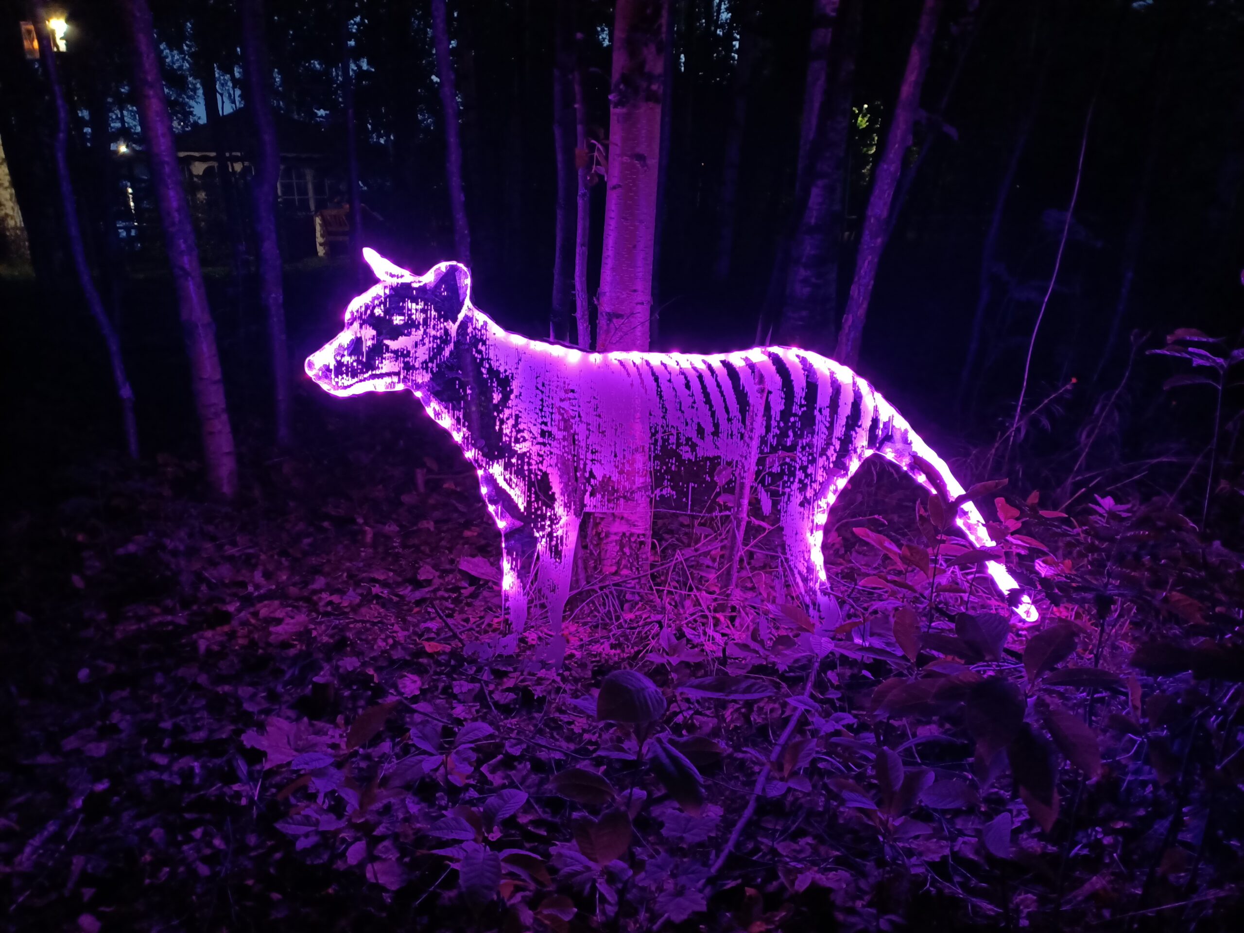 The Last Disco Animals are extinct animal species equipped with various pre-programmed LED strip light effects. The animals are cut and engraved from acrylic sheets, and the LED light attached to the edges travels along the engravings. The creatures pulse and flicker at different rhythms or remain statically illuminated. The first appearance of the Thylacine (Tasmanian tiger) was at the Night of the Arts in Old Pikisaari, on the “dance floor” of a forest disco. Inspired by its reception, the piece was later expanded and featured at ValoVIMMA in Siikajoki. The work carries a darkly humorous, end-of-times atmosphere, which was further emphasized by the flood-like conditions of ValoVIMMA—evoking a sense of apocalyptic surrealism.